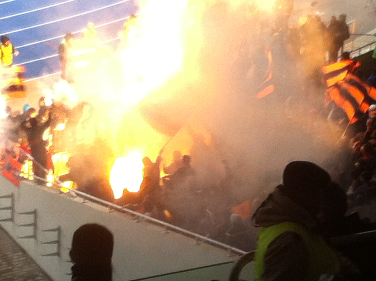 What use were this bunch – the biggest battalion of bollock-scratchers ever assembled in the history of bollock-scratching? Well they’re not proactive. They just stood and scratched as the best firework display I’ve ever seen at football poured smoke and light into the Olimpiskii. Not complaining, just observing.