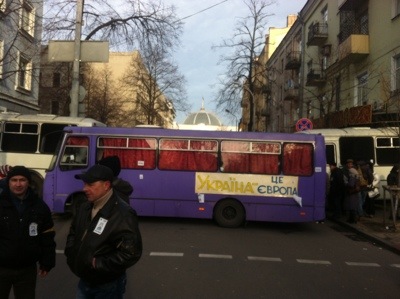 Above: Berkut, paramilitary police, occupy buses blocking the road to Parliament, visible in background. Someone has slapped a sign saying ‘Ukraine in Europe’ on it.