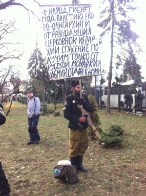 Above: this man wants to see the restoration of the Russian monarchy and a return to the pre-1917 political arrangement.