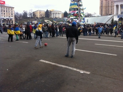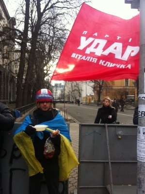 Above: Bankova, scene of violent clashes on Sunday. A protester sips soup next to a flag which proclaims support for Vitali Klitchko’s party. Activists restrict entry to the street. Police stand at other end of street.