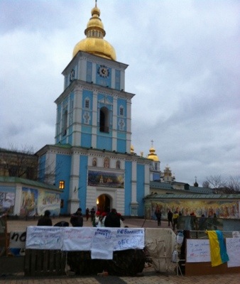 Above: a small encampment outside the Mikhailovsky Cathedral. At the weekend many people slept on the premises after clashes with police.