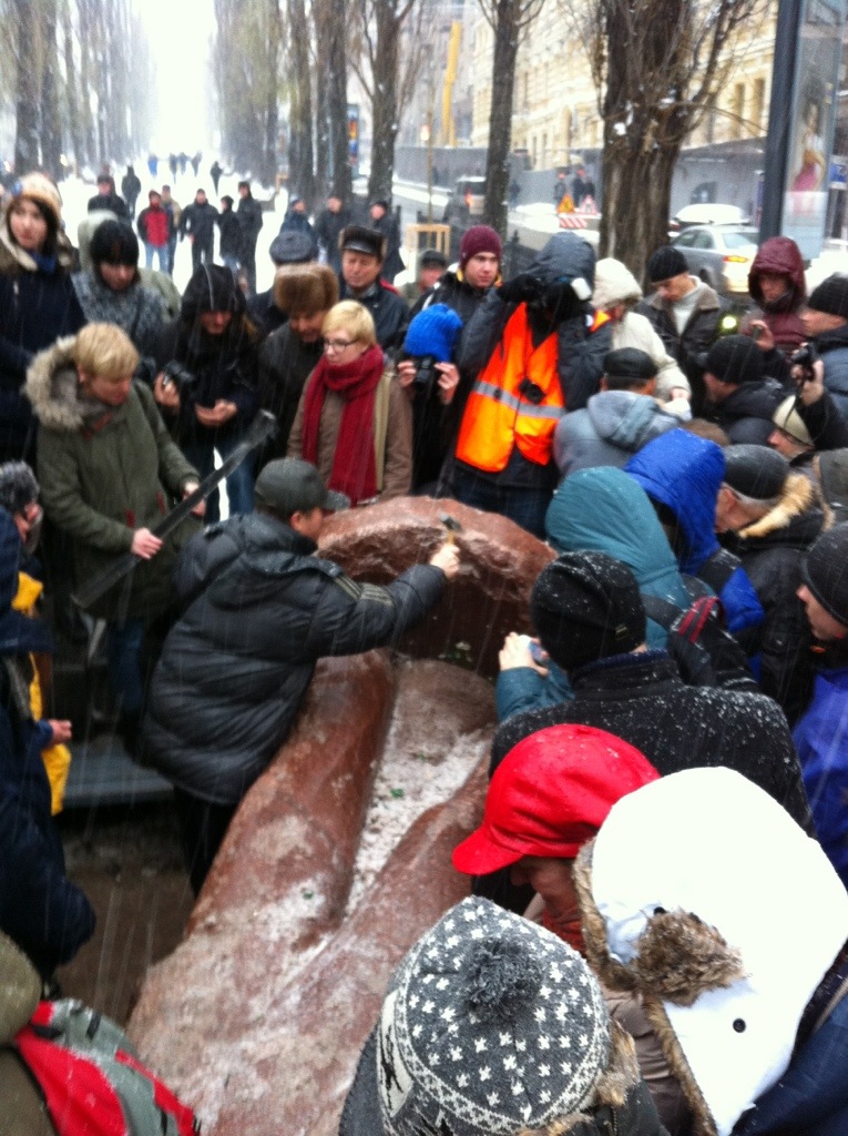 - Lenin gets a further battering from a sledgehammer-wielding protester