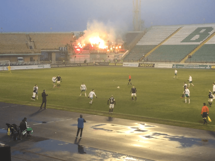 The 200 or so ultras in the corner whip out the red flares and make like it’s someone’s birthday.