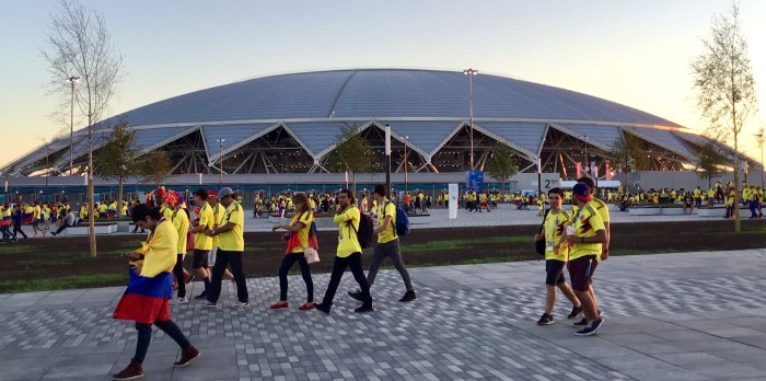 He elbows me as he barges past for a pic with a Senegal dancer and he gets one back, spilling his pint and causing him to drop his phone. It sums up the event – a dog-like, ferocious intensity pervades every action – and there’ll be 30,000 Colombians doing it all again tomorrow.