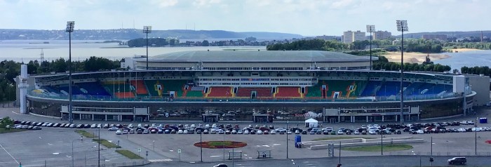 As at many of the stadiums it can be a long walk to reach Kazan Arena. Here, you’re dropped off by bus two miles from the arena – the authorities have ensured no unofficial transport can get close to venues.