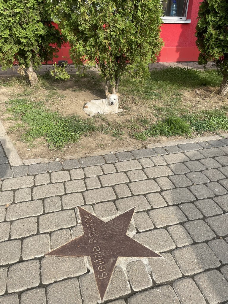 Ksushi, resident very lazy semi-feral dog, guards Bela Bartok, the Hungarian composer who was a big fan of Carpathian music.