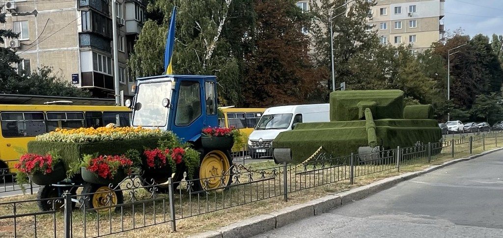 The famous meme of a Ukrainian farmer towing a Russian tank away is immortalised in this central reservation tribute.